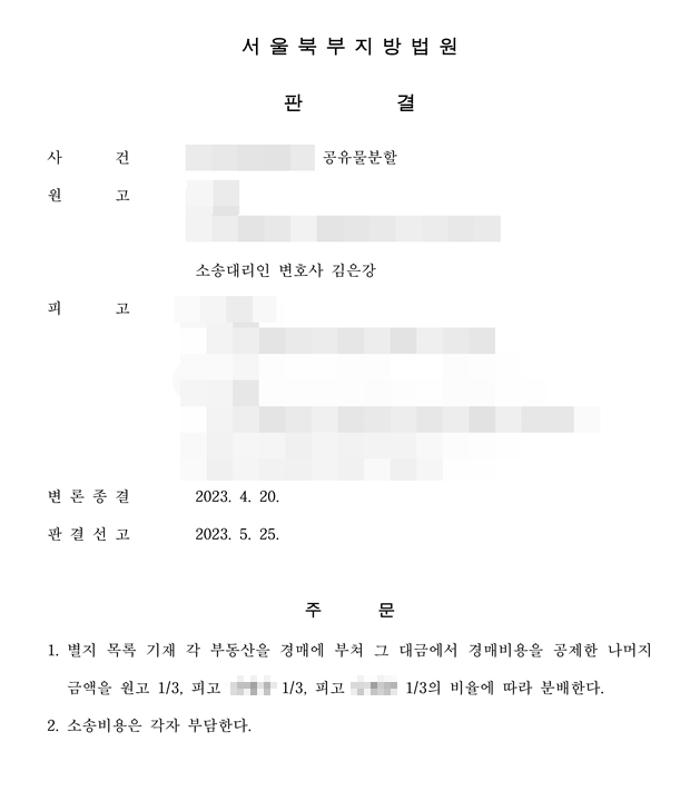 법원은 원고측 상가로이어의 청구를 받아들여 상가건물을 경매에 부쳐 공유자들이 1/3씩 대금을 분배하여 갖도록 판결하였습니다.