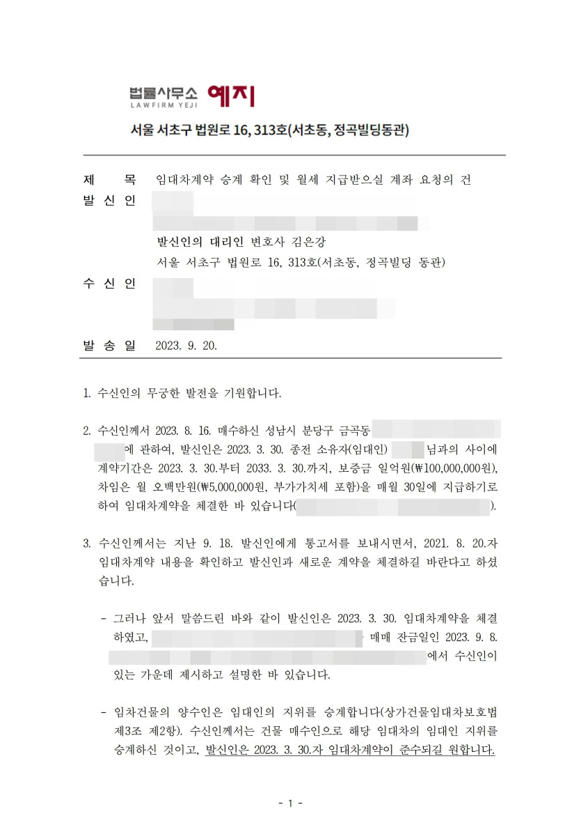 상가건물의 양수인은 종전 임대인의 지위를 승계합니다. 상가로이어는 의뢰인의 대리인으로 선임되어 신규 매수인에게 종전 임대인 지위 승계가 되었음을 확인하는 내용과 함께 월세 입금 계좌를 알려달라고 요청하면서, 향후 원만한 관계를 맺기를 원한다는 내용증명서를 새로운 임대인에게 발송하였습니다.